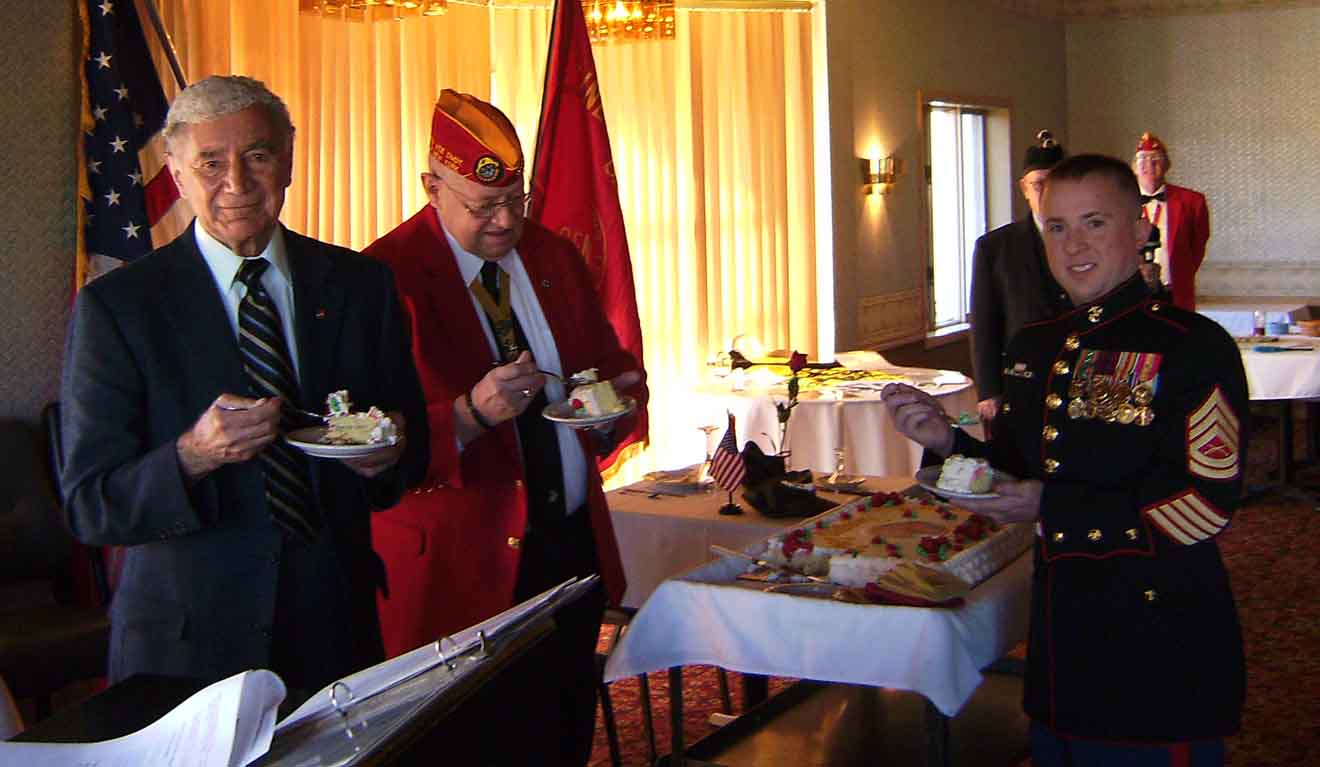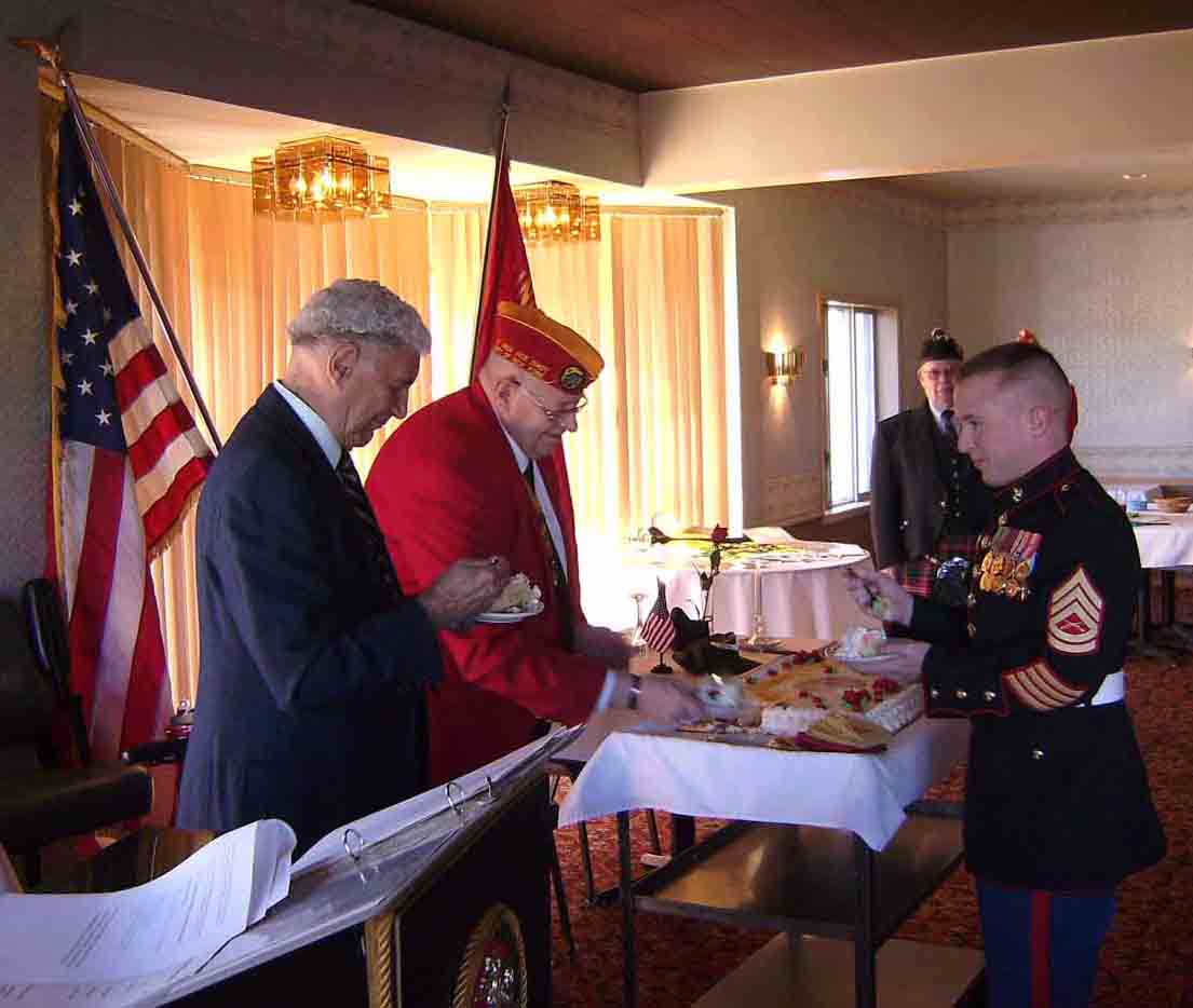 Marine Donald Mark ..oldest Marine(L) Marine Gordie Williams ... Commandant(C) GySgt. Mark Cordy USMC ... youngest Marine(R)